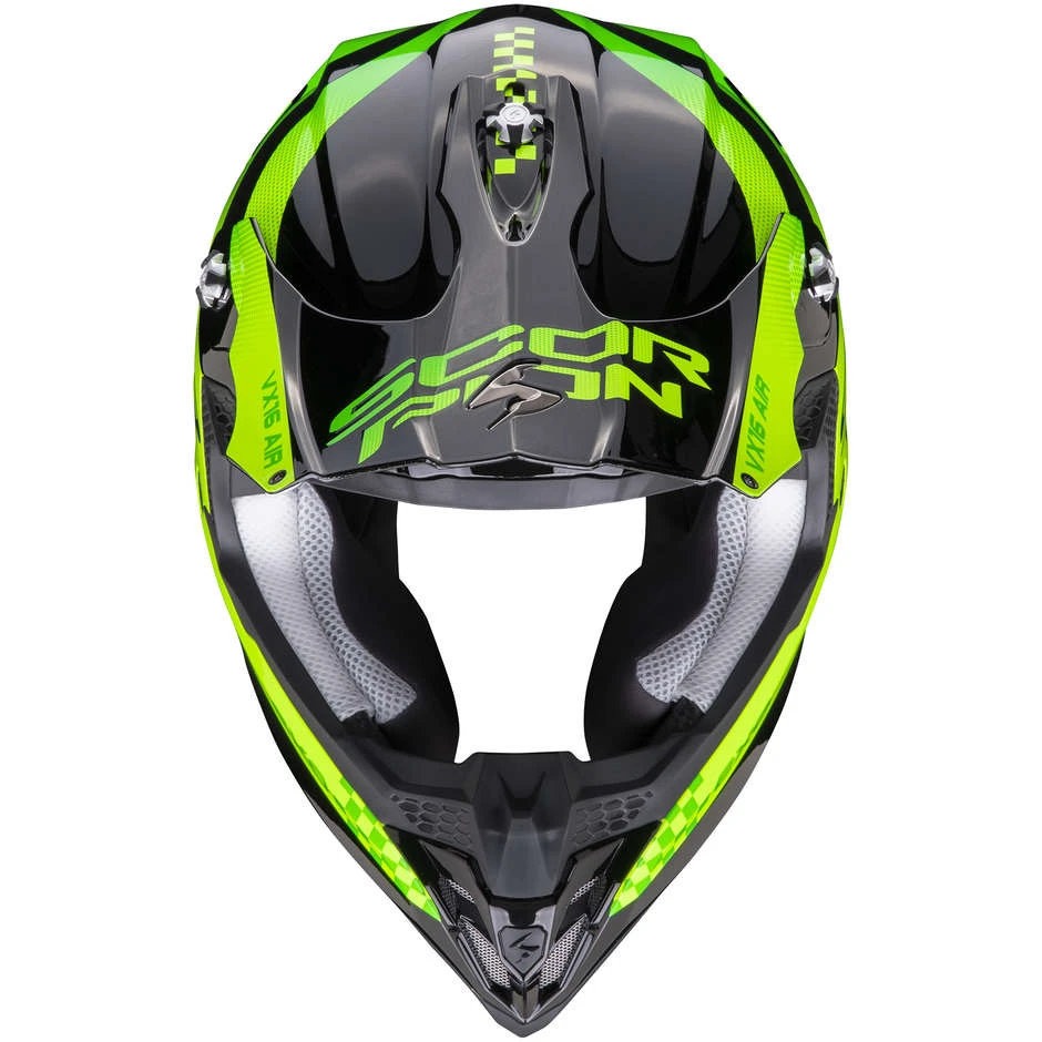 VX 16 erbt die technischen Eigenschaften von VX-15 wie Airfit, die weite Sichtbarkeit, den abnehmbaren Kinnschutz-Lufteinlass, die Schirmverlängerung und integriert sie mit einer deutlichen Komfortverbesserung durch das 3D-Laserschneiden der Wangenpolster, a größere Breite des Kinnschutzbereichs für eine bessere Sauerstoffversorgung und ein noch geringeres Gewicht dank einer speziell von Scorpion entwickelten Thermoplast-Schale.