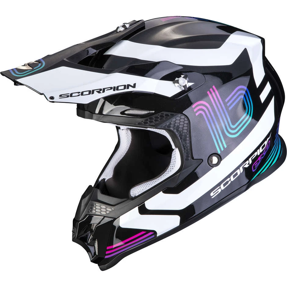 VX 16 erbt die technischen Eigenschaften von VX-15 wie Airfit, die weite Sichtbarkeit, den abnehmbaren Kinnschutz-Lufteinlass, die Schirmverlängerung und integriert sie mit einer deutlichen Komfortverbesserung durch das 3D-Laserschneiden der Wangenpolster, a größere Breite des Kinnschutzbereichs für eine bessere Sauerstoffversorgung und ein noch geringeres Gewicht dank einer speziell von Scorpion entwickelten Thermoplast-Schale.